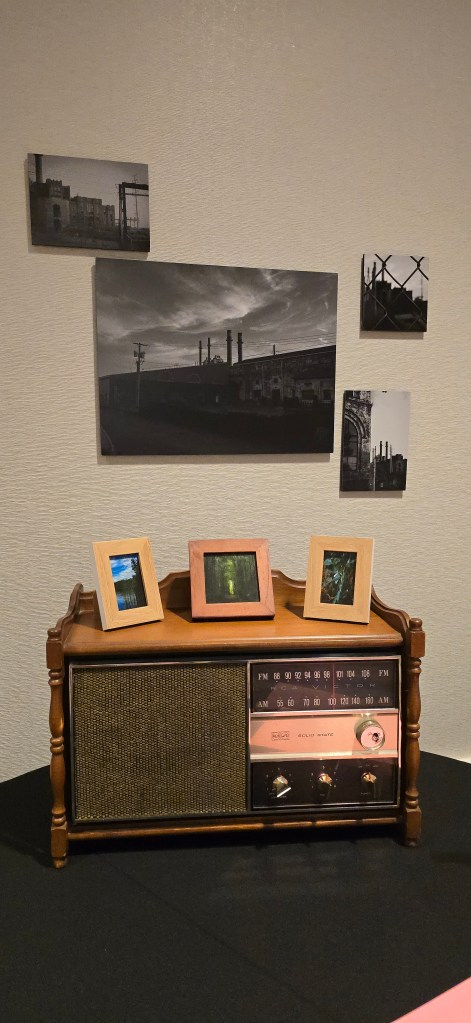 Surrounding photographs taken in New Haven pair images of a decaying power plant with delicate traces of life still enduring. This contrast highlights the connection between industrial exploitation and increasingly severe weather patterns. The radio becomes a receiver of warning, a relic transmitting the future we have shaped. The installation asks viewers to listen closely before the signals and the ecosystems fall silent.